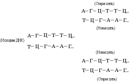 ДНК состоит из двух взаимно комплементарных цепей. В ходе репликации они расходятся, и каждая из них служит матрицей для синтеза новой цепи: