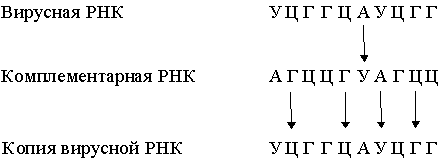 В нормальной клетке передача информации осуществляется только в направлении ДНК ДНК и ДНК РНК. Однако в клетках, инфицированных вирусом, возможны и другие процессы: РНК РНК и РНК ДНК. Генетический материал многих вирусов представлен молекулой РНК, обычно одноцепочечной. Проникнув в клетку-хозяина, эта РНК реплицируется с образованием комплементарной молекулы, на которой, в свою очередь, синтезируется множество копий исходной вирусной РНК: