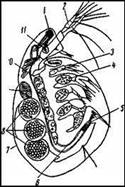 1 — глаз; 2 — гребные усики; 3 — первая грудная ножка; 4 — жаберный мешочек третьей пары ножек; 6 — анальное отверстие; 6 — кишка; 7 — раковинка; 8-яйца в выводковой камере; 9 — сердце; 10 — яичник; 11 — головной мозг.