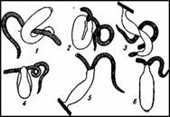 1,2 — пиявка схватывает червя; 3 — пожирает оторванный кусок; 4-6 — попытка оторвать еще кусок.