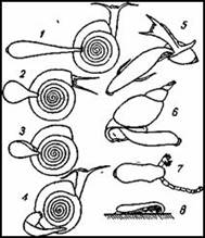 1-4 — различные фазы схватывания и подтягивания к себе катушки; 3 — пиявка с молодью высасывает небольшую катушку; 5 — пиявка высасывает крупного прудовика; 7 — пиявка сосет мотыля; 1, 6 — Glossosiphonia complanata; 8 — Helobdella stagnalis с молодью.