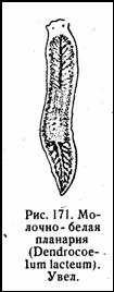 В северной и средней полосе СССР очень часто встречается молочно-белая планария (Dendrocoelum lacteum), самая крупная среди других (до 3 см), с совершенно белым телом, сквозь которое ясно просвечивает темный ветвистый кишечник (рис. 171). На голове можно различить пару глаз.