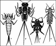 3. Ползающие формы, которые передвигаются по дну спокойных стоячих водоемов и по водным растениям. Тело их часто бывает покрыто песком или илом, что служит для них очень полезной маскировкой и спасает от хищников. У этих личинок ноги приспособлены для ползания по субстрату и хвостовые нити также лишены волосков. Эти формы часто встречаются на экскурсиях..