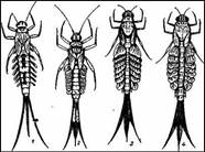 Плавающие личинки поденок. Увел. 1 — Baetis bioculatus; 2 — Cloeon dipterum; 3 — Siphlonurus aestivalis, 4 — Siphlurella linneana.