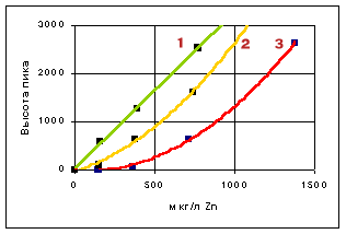 Градуировка по Zn при следующем содержании Cu 1 - Cu = 0 мкг/л; 2 - Cu = 192 мкг/л; 3 - Cu = 370 мкг/л. |
