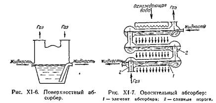 Аппараты, в которых осуществляются абсорбционные процессы, называют абсорберами. Как и другие процессы массопередачи, абсорбция протекает на границе раздела фаз. Поэтому абсорберы должны иметь развитую поверхность соприкосновения между жидкостью и газом. По способу образования этой поверхности абсорберы можно условно разделить на следующие группы: поверхностные и пленочные, насадочные, барботажные (тарельчатые), распыливающие.