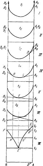 На рис.I изображены изотермические диаграммы удельного изобарного потенциала этой системы в жидком состоянии для температур t1 › t2 › t3 › t4 › t5 › t6 (диаграммы I—VI; VII — полученная из них диаграмма состояния). Точками Аs и Вs на всех диаграммах обозначены удельные изобарные потенциалы компонентов в твердом состоянии. Точки Al и Bl (концевые точки кривых) относятся к тем же компонентам в жидком состоянии.