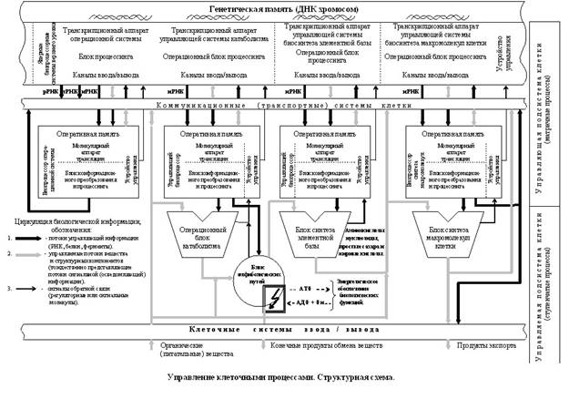 Структурная схема информационных процессов и сопряженных с ними процессов биохимических должна облегчить понимание биологической сущности живого состояния и показать важнейшие условия, необходимые для поддержания жизнедеятельности любых клеток. А приведенный материал в данной работе должен помочь понять информационную основу биологических процессов. Предлагаемая схема удобна тем, что в ней четко просматриваются важнейшие информационные принципы организации живой клетки, указаны направления потоков управляющей и сигнальной (осведомляющей) информации. Такого рода схема показывает, что управляющую систему и метаболизм живой клетки можно наглядно представить в виде нескольких отдельных операционных (функциональных) блоков.
