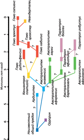 Различные представители семейства гоминид (вероятные предки и близкие родственники современного человека). Большая часть связей между ветвями эволюционного дерева пока под вопросом. |
