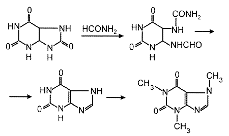 В промышленности большую часть кофеина синтезируют из мочевой кислоты через ксантин. Растения синтезируют его тоже через ксантин, который получается из аденина и гаунина |