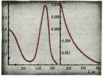 Рис. 2. Эритемная чувствительность кожи, обозначенная буквой ч, имеет два максимума — в областях жёсткого и среднего ультрафиолета. При мягком ультрафиолете чувствительность на два порядка ниже, так что пришлось пристроить отдельно „окончание“ графика. |