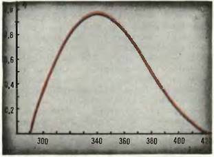 Рис. 3. Здесь показана пигментирующая способность ультрафиолета с различной длиной волны. Пик только одни но уже в другой области. Поскольку данные приведены относительные, сравнивать первый и второй графики в цифрах не следует. |