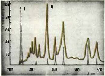 Рис. 4. Спектральный состав излучения лампы „Фотон“ (кривая I) и ртутной лампы высокого давления (кривая II) |