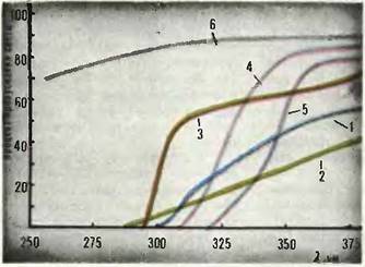 Рис. 5. Прозрачность шести распространённых материалов в ультрафиолетовой области: 1 — лавсановая плёнка, 0,15 мм; 2 — поливинилхлоридная плёнка, 0,15 мм; 3 — оргстекло, 2,5 мм; 4 — оконное стекло, 1 мм; 5 — то же, 6 мм; 6 — оптический кварц, 3 мм. |
