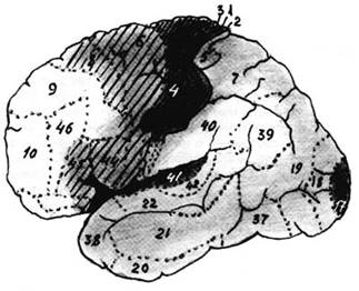 Четвёртый фактор — обширность поражения. В целом чем больше очаг поражения, тем больше выпадений функций мозга. А поскольку основу структурной организации мозга составляет сеть из нейронов, выпадение одного участка сети может затронуть работу других, удалённых участков. Вот почему нарушения речи нередко отмечаются при поражении областей мозга, расположенных далеко от специализированных областей речи, например центра Брока (поля 44–45 на рис. 1).
