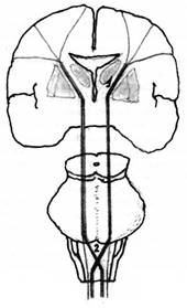 Третий фактор — локализация повреждения мозга. Небольшое по размеру, повреждение может затронуть область плотного скопления нервных волокон, идущих к различным отделам организма, и стать причиной тяжкого недуга. К примеру, через небольшие участки мозга, именуемые внутренними капсулами (их две, по одной в каждом полушарии), от мотонейронов коры мозга проходят волокна так называемого пирамидного тракта (рис. 2), идущего в спинной мозг и передающего команды для всех мышц туловища и конечностей. Так вот, кровоизлияние в области внутренней капсулы может привести к параличу мышц всей половины тела.