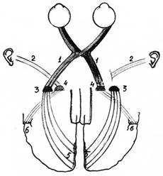 Рис. 3. Операция подсадки зрительного тракта к медиальному коленчатому телу таламуса. Слева показан нормальный ход нервных путей от глаз и ушей, справа — их расположение после операции. (Нервные пути, несущие слуховую информацию, отсекали от медиальных коленчатых тел и на их места подсаживали окончания зрительных нервов, отделённые от латеральных коленчатых тел таламуса. Было уничтожено также нижнее двухолмие в среднем мозге, где переключается часть нервных путей от уха в слуховую кору (не показано на схеме): 1 — зрительный тракт, 2 — слуховой тракт, 3 — латеральные коленчатые тела таламуса, 4 — медиальные коленчатые тела таламуса, 5 — таламокортикальные пути к зрительной коре, 6 — таламокортикальные пути к слуховой коре. |