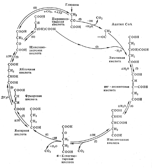 1, 6 – система окисления и декарбоксилирования; 2 – цитрат-синтеза: кофермент А; 3, 4 – аконитат-гидратаза; 5 – изоцитратдегидрогеназа; 7 – сукцинатдегидрогеназа; 8 – фумарат-гидрогеназа; 9 – малатдегидрогеназа; 10 – спонтанное превращение; 11 – пируваткарбоксилаза