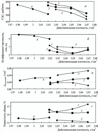 Обожженные образцы на основе пековых коксов характеризуются меньшей пористостью, более высокими значениями кажущейся плотности, их электропроводность, механическая прочность, теплопроводность и модуль упругости также выше, чем у образцов из нефтяных коксов.