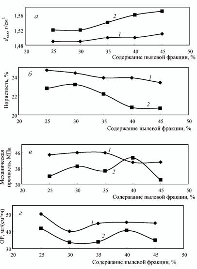 Исследования показывают преимущество пыли с удельной поверхностью 4500 м2Д по сравнению с пылью, удельная поверхность которой 3500 м2/г. Начиная с дозировки пылевой фракции 30%, обожженные образцы имеют более высокую кажущуюся плотность, меньшую пористость и меньшую разрушаемость в токе СО2, при том же удельном электросопротивлении (УЭС). Хотя механическая прочность образца из более дисперсной пыли и снижается, полученные значения характеристик отвечают требованиям действующих ТУ и зарубежных стандартов на обожженные аноды (не менее 320 кг/см2).