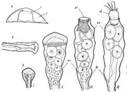 Медузоидные почки (гонофоры) закладываются на бластостиле в проксимальной его части. Затем, по мере роста бластостиля, они продвигаются к устью гонотеки, одновременно дифференцируясь в маленьких медузок. Обычно бластостиль, продолжая расти, выталкивает верхних сформированных медузок через устье гонотеки. При этом рост происходит ритмичными пульсациями. Свернутая медузка втискивается в устье гонотеки, в котором бластостиль образует пробку. Пробка отжимается медузкой, образуя щель, через которую она выворачивается наружу (рис. 2, В, IV}. Медузки отделяются от бластостиля и, становясь свободными, уплывают. Иногда, впрочем, отделение медузки от бластостиля происходит еще внутри гонотеки. Тогда она переворачивается и присасывается к бластостилю ротовым стебельком; благодаря этому добирается до устья и выходит наружу.