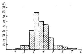 Рис. 3. Вариационный ряд величин расстояний между побегами на столонах. N—количество наблюдений; L—расстояние между побегами, мм