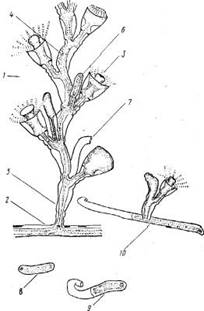 1 — побег, 2 — столон, 3 — гидрант, 4 — междоузлие, 5 — ножка побега, 6 — формирующая фрустула, 7— трубка перисарка после отделения фрустулы, 5 — осевшая фрустула, 9 — рост столона из фрустулы, 10 — образование побега