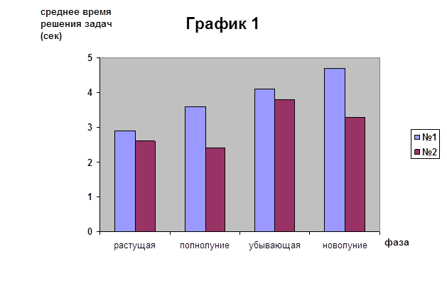 В ходе проведения эксперимента были получены данные, которые фиксировались в таблице (см. Таблица 1). Для двух испытуемых я получил средние значения времени решения примеров соответственно 2,9 и 2,6 в период растущей Луны; 4,1 и 3,8 в период убывающей Луны; 3,6 и 2,4 в полнолуние; 4,7 и 3,3 в новолуние. Более наглядно зависимость среднего времени решения примеров от фазы Луны отражена на Графике 1.