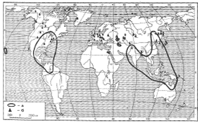 Cовременное распространение (а) и ископаемые находки (б) лотоса