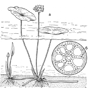 Лотос – растение травянистое, земноводное, стебли его превратились в ползучие корневища, погруженные в песчаное дно водоема. Корневища эти мощные, ветвящиеся, с хорошо выраженными шаровидными узлами, от которых отходят многочисленные корни. На зиму в корневищах откладывается крахмал, благодаря чему они очень разрастаются в толщину. В узлах корневищ образуются почки, в которых формируются как листья, так и цветки. На поперечном срезе корневища видно, что оно пронизано многочисленными одиночными пучками, расположенными концентрическими кругами, разделенными крупными воздухоносными полостями.