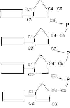 Мономеры соединяются между собой через пентозу в С3 положении и остаток фосфорной кислоты с помощьюфосфорной диэфирной связи.