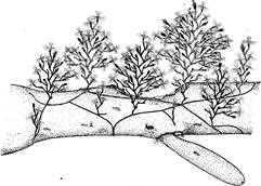 В результате такого строения побег О. loveni обычно напоминает дерево с раскидистой кроной. Диаметр этой кроны достигает подчас 15 мм и более. Так как расстояние между основаниями побегов в среднем 3 мм, то большие побеги колонии, растущей на плоскости, должны переплетаться, увеличивая концентрацию гидрантов. Напротив, на цилиндрическом субстрате, таком как толстая веревка или таллом аскофилума, побеги должны в меньшей степени мешать друг другу, эффективно используя окружающее пространство (рис. 3).