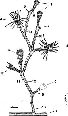 Рис. 2. Строение побега, зооидов и гидроризы: 1 — формирующиеся гидранты на разных стадиях развития, 2 — верхушки роста, 3 — гидранты с открытым и закрытым гипостомами, 4 — гонангий, 5 — сжавшийся гидрант с выставленными из гидротеки “сторожевыми” щупальцами, 6 — гидротека, оставшаяся после рассасывания гидранта, 7 — первое междоузлие всегда наклонено в дистальном направлении, 8 — столон (ветвь гидроризы), 9 — дистальная зона кольчатости междоузлия (ножка гидранта), 10 — проксимальпая зона кольчатости междоузлия, 11 — перисарк, 12 — ценосарк, 13 — боковая ветвь побега