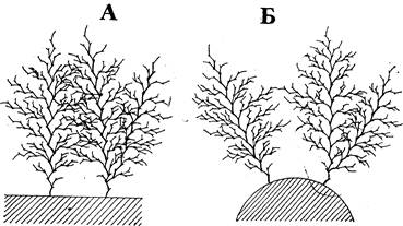 Рис. 3. Схема взаимного положения разветвленных побегов на плоском (А) и цилиндрическом (Б) субстрате. На плоском субстрате происходит переплетение ветвей побегов, на цилиндрическом — более эффективное использование окружающего пространства