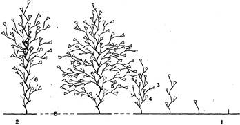 В расположении побегов по столону также наблюдается определенная закономерность. Так как новые побеги образуются только вблизи растущих верхушек столонов, то естественно, что самые старые (а следовательно, и самые большие) побеги находятся в центре колонии. Получается, что высота побегов на ветви гидроризы постепенно уменьшается к периферии (рис. 4). При сильном недостатке пищи старейшие побеги начинают рассасываться. В этом случае их размеры могут быть меньше, чем более молодых соседей. При нормальном питании рассасывание отдельных гидрантов и ветвей все равно в старых побегах более выражено, чем в молодых. У них постепенно рассасываются нижние гидранты и веточки, так что базальная часть ствола обнажается (рис. 4, 2).