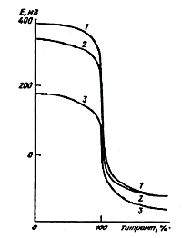 Для определения вышеупомянутых объектов мне было рекомендовано использовать титрование тетрафенилборатом натрия (ТФБН), так как при этом образуются нерастворимые в воде осадки. Было известно, что потенциометрическое титрование четверичных аммониевых солей проходит с большими скачками титрования, что, безусловно, должно было бы приводить к приличной точности определения (рис. 1, кривые 1,2).
