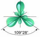 1. sp3 - Гибридизация. Одна s- орбиталь и три p- орбитали превращаются в четыре одинаковые "гибридные" орбитали, угол между осями которых равен 109°28'.