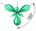2. sp2 - Гибридизация. Одна s- орбиталь и две p- орбитали превращаются в три одинаковые "гибридные" орбитали, угол между осями которых равен 120°.