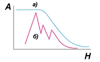 Итак, я начал измерять активность образцов счетчиком импульсов. Поскольку активность проб была большая, то можно было ожидать, что график зависимости активности (A) от расстояния пробы от датчика (H) будет таким, как это показано на рис.1а. Каково же было мое удивление, когда я не увидел ожидаемой картины, так как экспериментальная кривая имела несколько максимумов (рис.1б)!