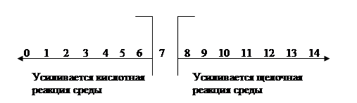 Если концентрация ионов гидроксония больше концентрации гидроксид–ионов, то есть [Н3О+] > [ОН-], то реакция среды становится кислой. Кислотность тем выше, чем больше концентрация ионов гидроксония. Если наоборот, концентрация ионов гидроксония меньше концентрации гидроксид–ионов, то есть [Н3О+] < [ОН-], то реакция среды становится щелочной. Следовательно, по значению концентрации этих ионов можно количественно охарактеризовать реакцию среды.