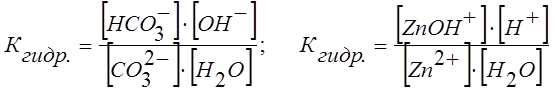 Например, для равновесного состояния I ступени гидролиза Na2CO3 и ZnCl2 Кгидр выразится уравнениями: