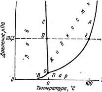 Превращения, происходящие с водой при атмосферном давлении, отражаются на диаграмме точками или отрезками, расположенными на горизонтали, отвечающей 101,3 кПа (760 мм рт. ст.). Так, плавление льда или кристаллизация воды отвечает точкеD , кипение воды—точке Е, нагревание или охлаждение воды — отрезкуDE и т. п.