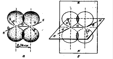 Таким образом, одна из электронных пар двойной связи между атомами углерода осуществляют обычную s-связь, вторая электронная пара образуется электронами не участвующими в гибридизации и сохранившими p-состояние. Облака этих электронов, сохранившие форму объемных восьмерок, направлены перпендикулярно к плоскости, в которой расположены s-связи молекулы этилена и перекрываются над и под этой плоскостью.