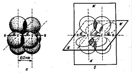 Два гибридных облака каждого атома С в ацетилене участвуют в образовании двух s-связей (третье валентное состояние углерода). В ацетилене всего три s-связи (одна C—C и две C—H), расположенные на одной прямой. В результате же перекрывания облаков электронов, сохранивших p-состояние, возникают две p-связи, образованны и двух взаимно перпендикулярных плоскостей (рис. 6). Тройная связь в ацетилене имеет длину 1,20 А (0,120 нм), т.е. углеродные атому сближены еще больше, чем в случае двойной связи.