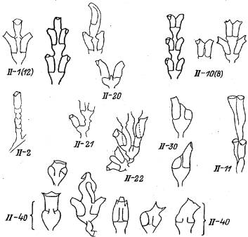II—11. Две уродливые сросшиеся гидротеки без ценосарка между ними. Аномалия аналогична предыдущей за важным исключением — морфогенез верхушки нарушен, и форма образующихся гидротек уродлива. Встречается очень редко.