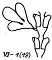 VI—1(19). Боковой побег в виде триады гонотек. В боковом побеге после расчленения верхушки на 3 зачатка из каждого зачатка образовалась гонотека. Из 3 гонотек центральная более крупная.