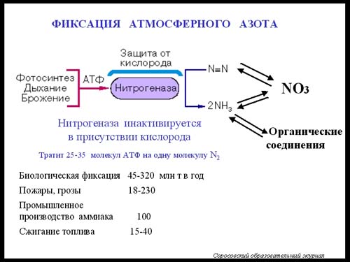 Некоторые виды бактерий и архей способны к фиксации азота. Примерно половина азота, входящего в состав живых организов, фиксируется бактериями. Азотфиксация, то есть превращение атмосферного азота в различные соединения, осуществляется ферментом нитрогеназой. Фиксация азота – один из наиболее дорогих биохимических процессов: на фиксацию одной молекулы азота расходуется 16 молекул АТФ. Есть менее эффективные системы фиксации, которые расходуют для этих целей до 35 молекул АТФ. Есть и небиологическая фиксация азота. После того, как начали производить удобрения (промышленная фиксация азота), человек вполне успешно может конкурировать с биологическими фиксаторами и биосферой в количестве фиксируемого азота.