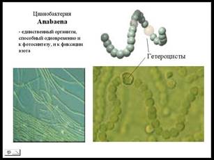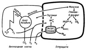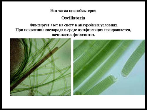 Как уже говорилось, нитрогеназа чувствительна к кислороду. В его присутствии она инактивируется и тогда не обратима. А сине-зеленые водоросли занимаются фотосинтезом, при котором образуется кислород, и процесс фиксации азота несовместим с процессом фотосинтеза. В результате, днем нитчатая цианобактерия осциллятория занимается фотосинтезом, а ночью, когда фотосинтез не идет, она занимается фиксацией азота.