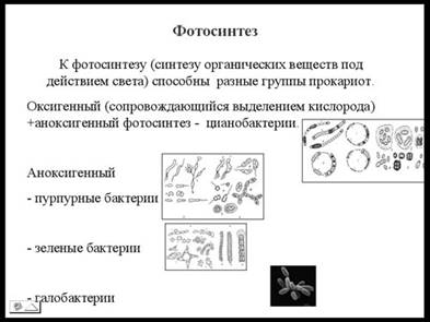 К фотосинтезу способны многие представители прокариот. Раньше мы упоминали уже, что фотосинтез бывает оксигенный и аноксигенный фотосинтез. Совмещают оба этих вида опять же цианобактерии. Большинство бактерий способны поводить только один из двух типов фотосинтеза. Встречаются фотосинтетики и среди архей.