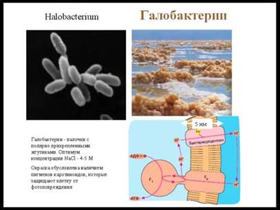 Прокариоты пользуются более широким спектром излучения. Наиболее простая схема фотосинтеза – у археи галобактерии, живущей в Мертвом море. Красноватая окраска этих бактерий обусловлена наличием пигментов каротиноидов, защищающих клетки от фотоповреждений, которые вполне возможны при высокой интенсивности солнечного света. Фотосинтез у галобактерий проводится специальным белком бактериородопсином. Этот белок находится в клеточной мембране, улавливает квант света и переводит его энергию в электрохимический заряд на мембране (DmH). В качествен "антенны", улавливающей свет в бактериородопсине, используется ретиналь – светочувствительная молекула, такая же, как та, что содержится в родопсине, светочувстительном белке высших организмов.